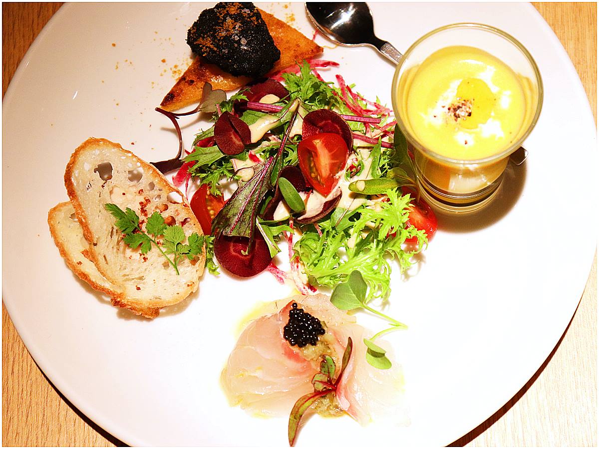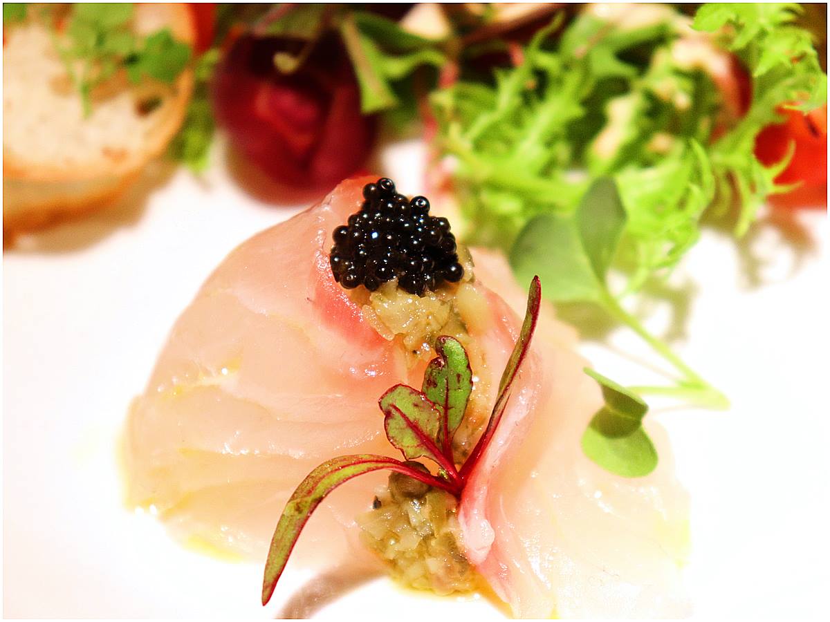 真鯛のカルパチョは、ケイパーとコルニッション、そしてキャビアがアクセントに。