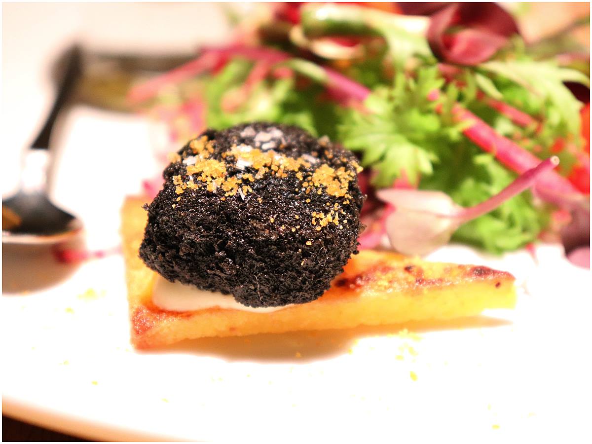 トウモロコシの粉“ポレンタ”を使用した焼きポレンタの上には真鱈の竹炭フリット。ヴェネチアの有名な郷土料理“バッカラ・マンテカート”をアレンジした一品だそう。