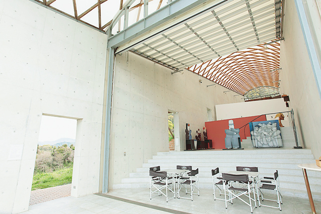 訪れてすぐに目を引くのが、エントランスに展示されたノア・カッツの「キッシング・ドア」。扉を閉めると男女の顔が近づく仕掛けがおもしろいアート作品です。館内には、こういった立体の現代アートが30点ほど展示されていて、訪問客の目を楽しませてくれます。さらに、オープンテラスからは、瀬戸内海の島々が一望できて気分も爽快!アートと絶景のコラボレーションにワクワクするミュージアムです。