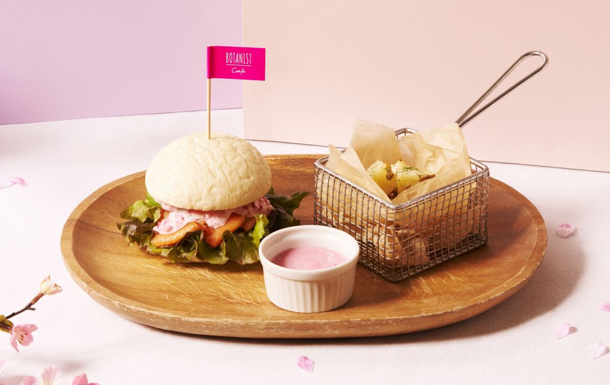 「BOTANIST café」で提供されるメニューは、「サクラの香りをまとってお出かけできる」というスプリングシリーズ商品のコンセプトと同じく、かわいいサクラ色。フレッシュな野菜と、たっぷりのサーモンをサンドした「スプリングバーガー(ドリンク付)」1430円は、テイクアウトできるから、お花見やピクニックにおすすめ。春らしいピンクのタルタルソースとサクラのパウダーがポイントです。ほくほくポテトは、自家製赤玉ねぎソースにディップして召し上がれ。