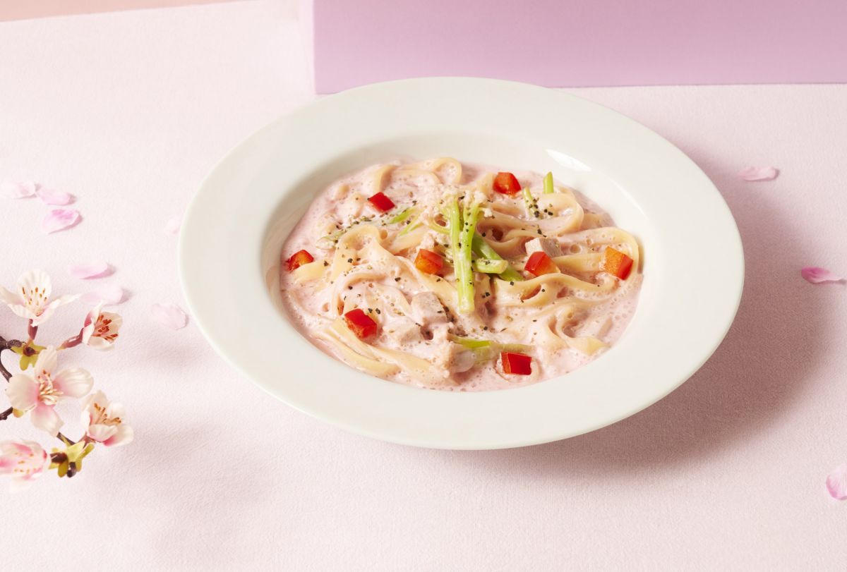 人気メニューのヴィーガンカルボナーラを春仕様にアレンジした「スプリングカルボナーラ(ドリンク付)」1330円。濃厚な味わいはそのままで、サクラ色に染まったソースを旬の春野菜にからめて楽しんで。