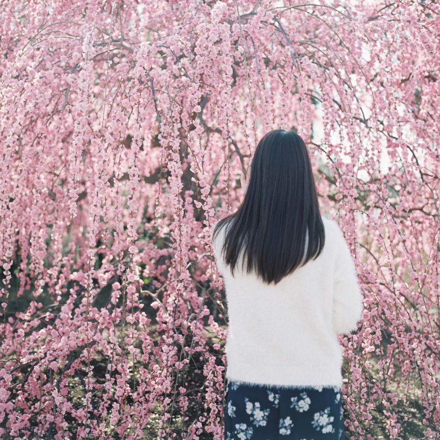梅園の中では、散策道のみ入れます。散策道から梅と一緒に写真を撮ったり、甘い香りを楽しむことができます。さて、撮影に関するポイントを一点。青空にピンクというのが一番かわいく見える相性なのは間違いなしなのですが、空が青くなくても、光があるだけで写真はグッと良くなります。髪や顔に光が当たっている感じや、カット全体が光に包まれて温かい感じは、写真の雰囲気がぐっと出るので試してみて下さい。