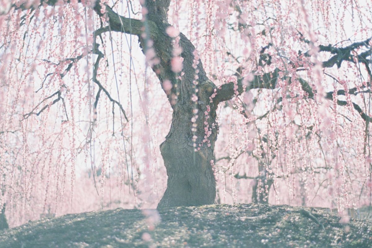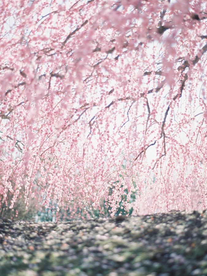 地面すれすれまで垂れ下がっている、しだれ梅。ここから満開を過ぎると、地面が散った花びらでピンクのじゅうたんのようになるので、花の季節が終わってからも楽しめそうです。この写真のように光があると、隙間に入ってくる木漏れ日が綺麗なので、枝垂れている内側とかもおすすめです。