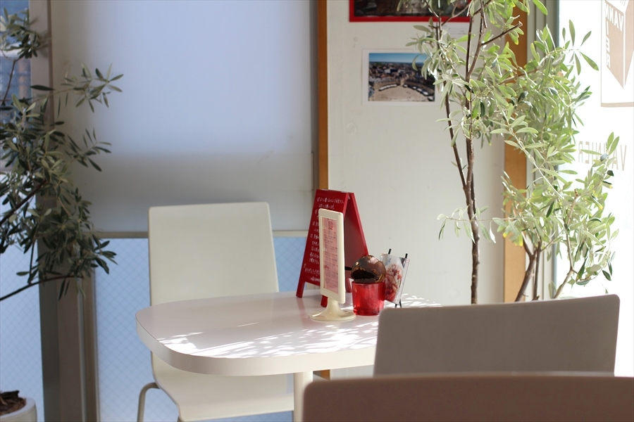 店内は、差し色の赤が映える開放的ですっきりとした空間。