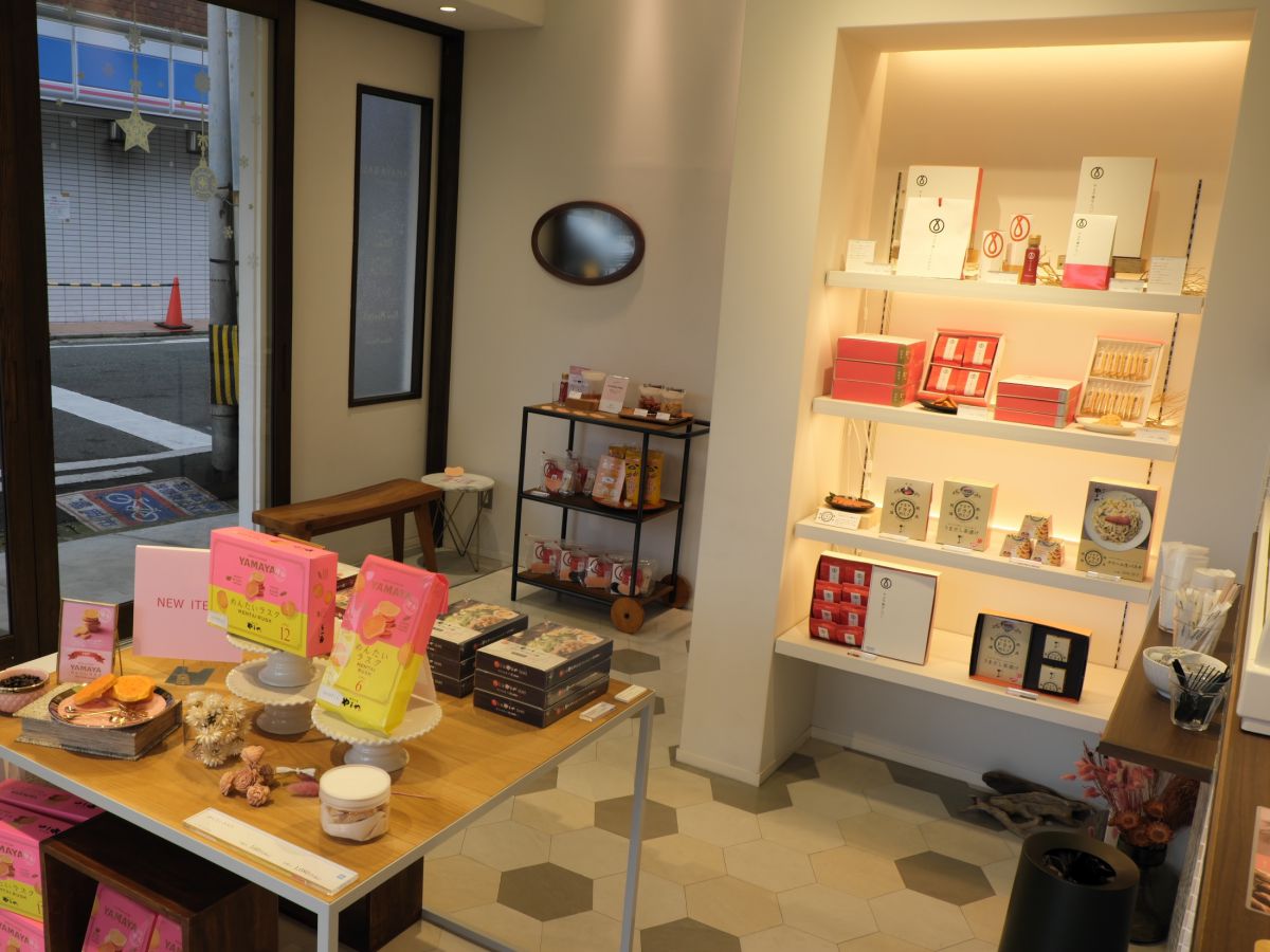 白を基調とした清潔感溢れる店内に、お土産が並んでいます。
