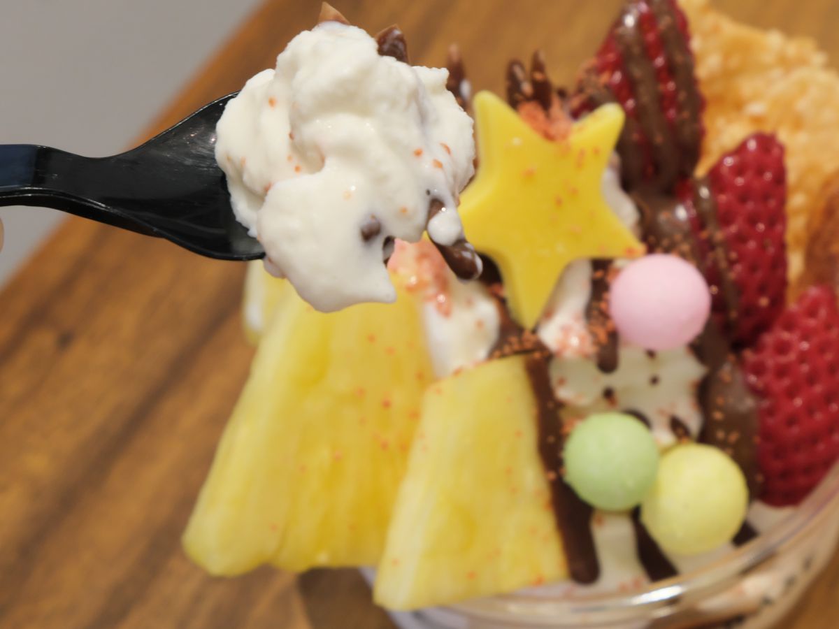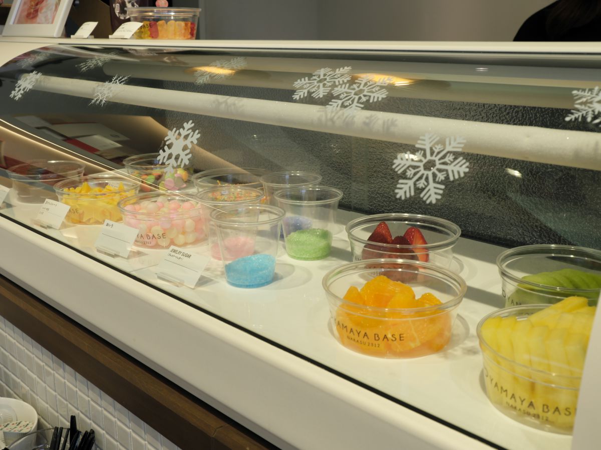 フルーツやおいり(シナモンフレーバーの小さな餅菓子)、チョコレートなどの豊富なトッピングから、好きなものを5種類選びオーダーしましょう。