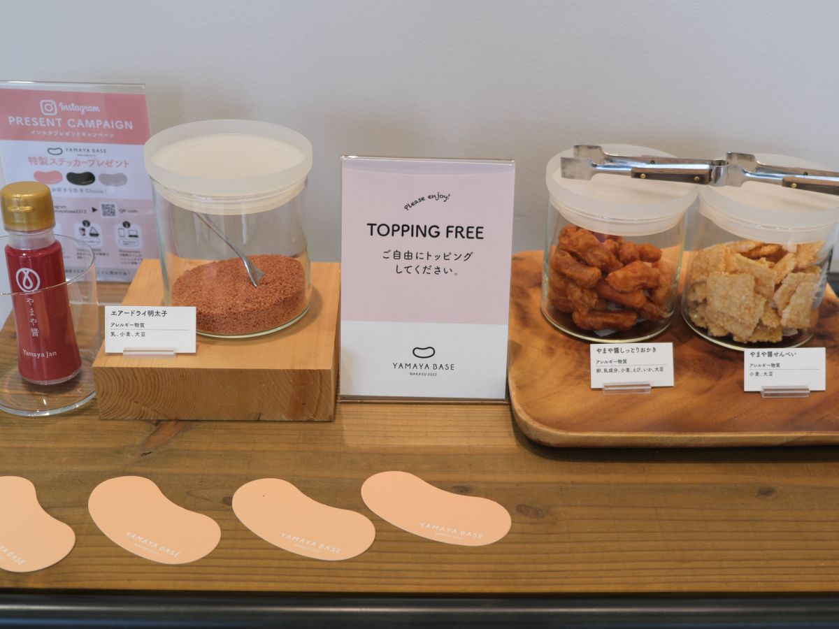ソフトクリームを受け取ったら、トッピングにトライしてみて。やまや醬、エアードライ明太子、やまや醬しっとりおかき、やまや醬せんべいが自由に盛り付けられます。
