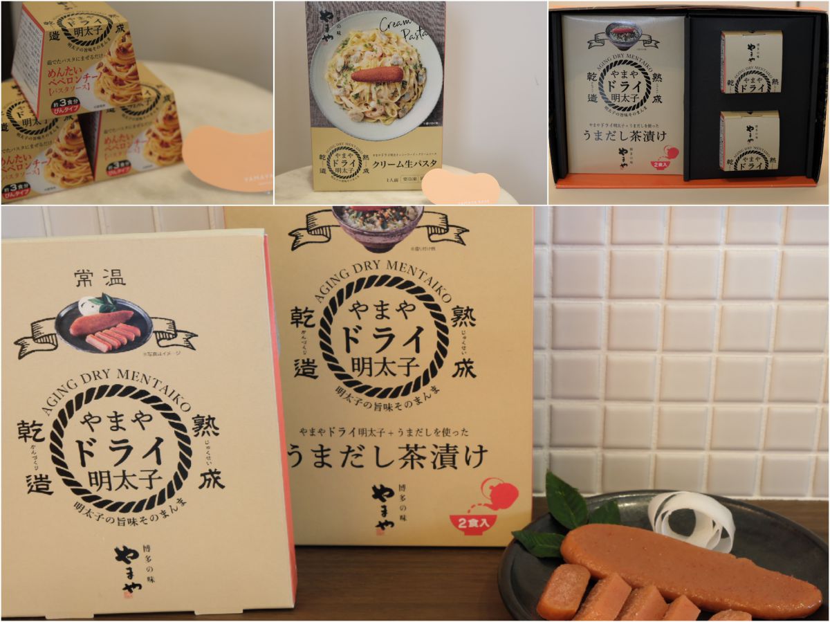 ほかに、ドライ明太子を使用したうまだし茶漬け(648円)、めんたいペペロンチーノパスタソース(648円)、ドライ明太クリーム生パスタ(冷凍食品)(1296円)もありますよ。手土産としても最適な、やまやドライ明太子ギフトセット(3618円)もあり、よりどりみどり。