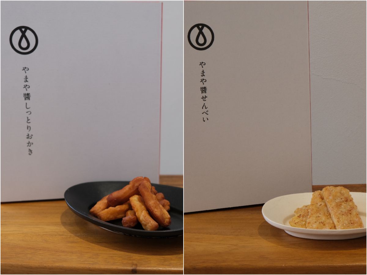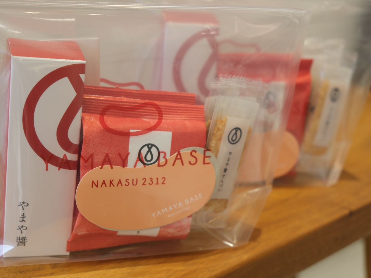 YAMAYA BASE限定セット(1080円)は、やまや醤、やまや醤せんべい、やまや醤しっとりおかき、オリジナルステッカーがロゴ入りポーチに入っているという欲張りアイテムです。
