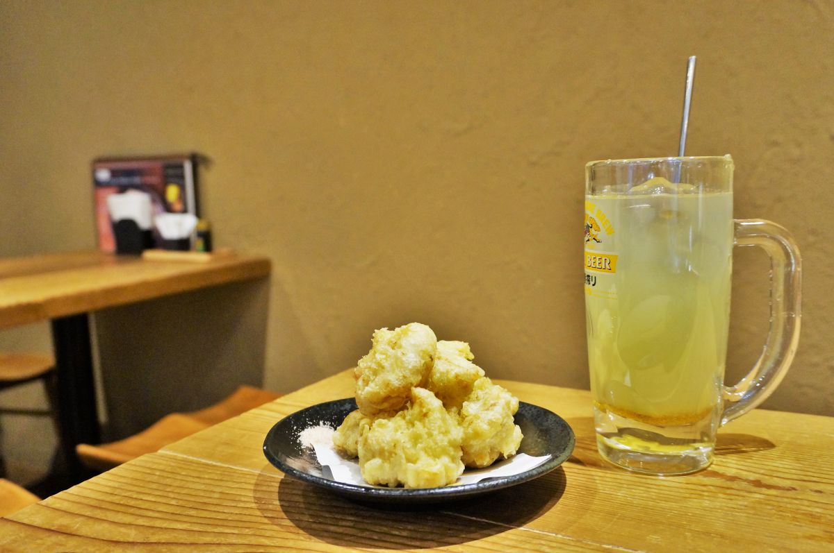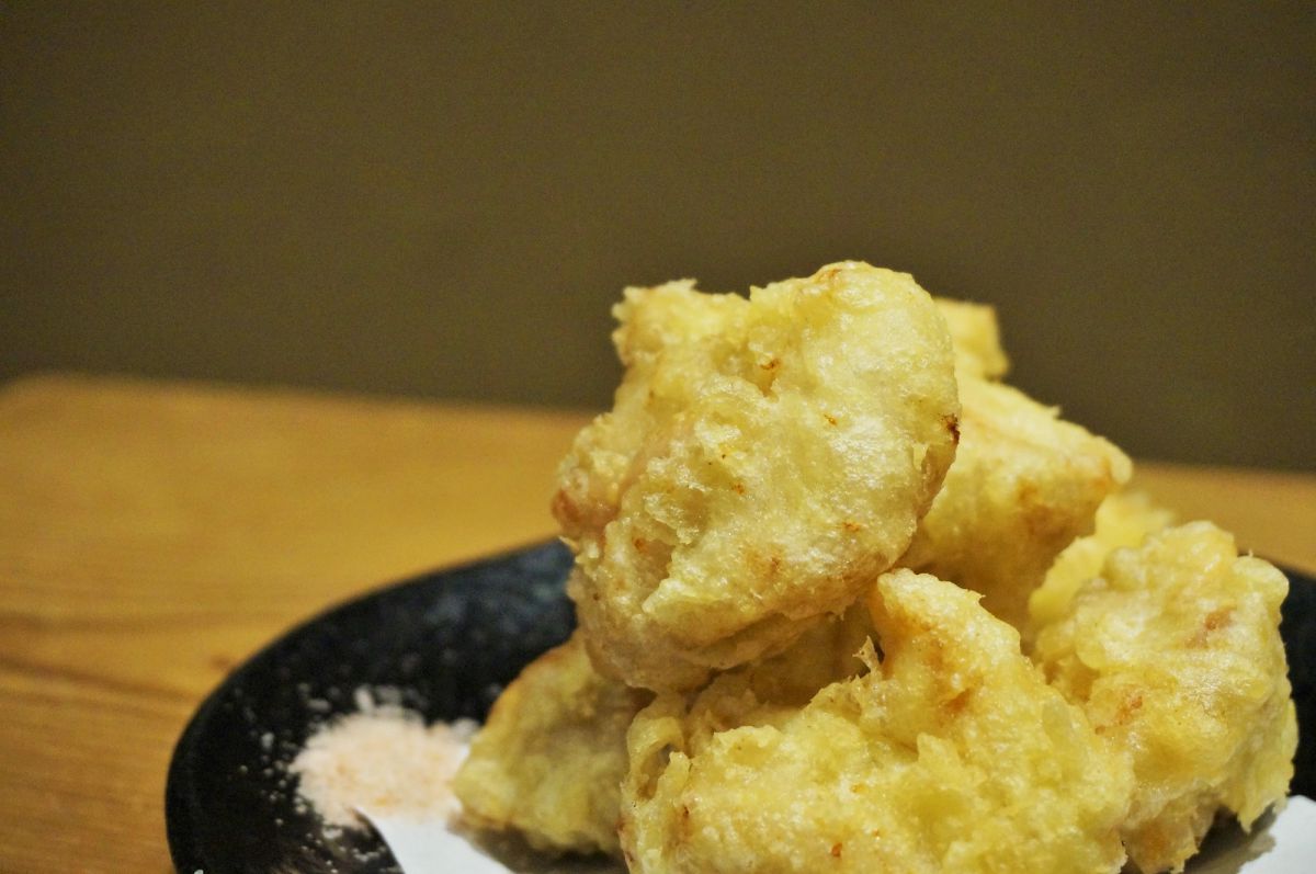 天ぷらのなかでも人気なのが名物の「鶏天」!熱々プリプリで弾力があります。