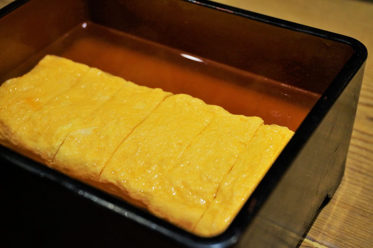 鮮やかな黄色が印象的な卵焼きは、やさしい味の出汁に浸かっているのが特徴です。