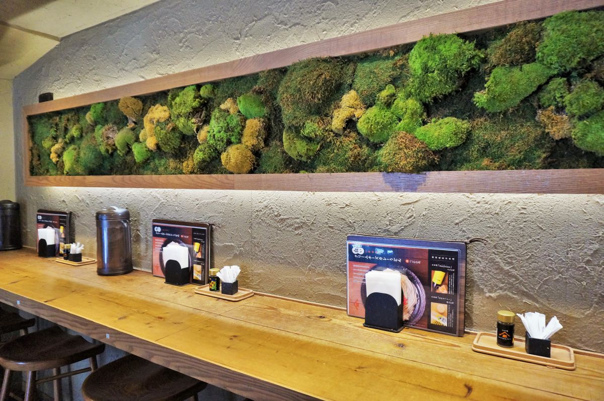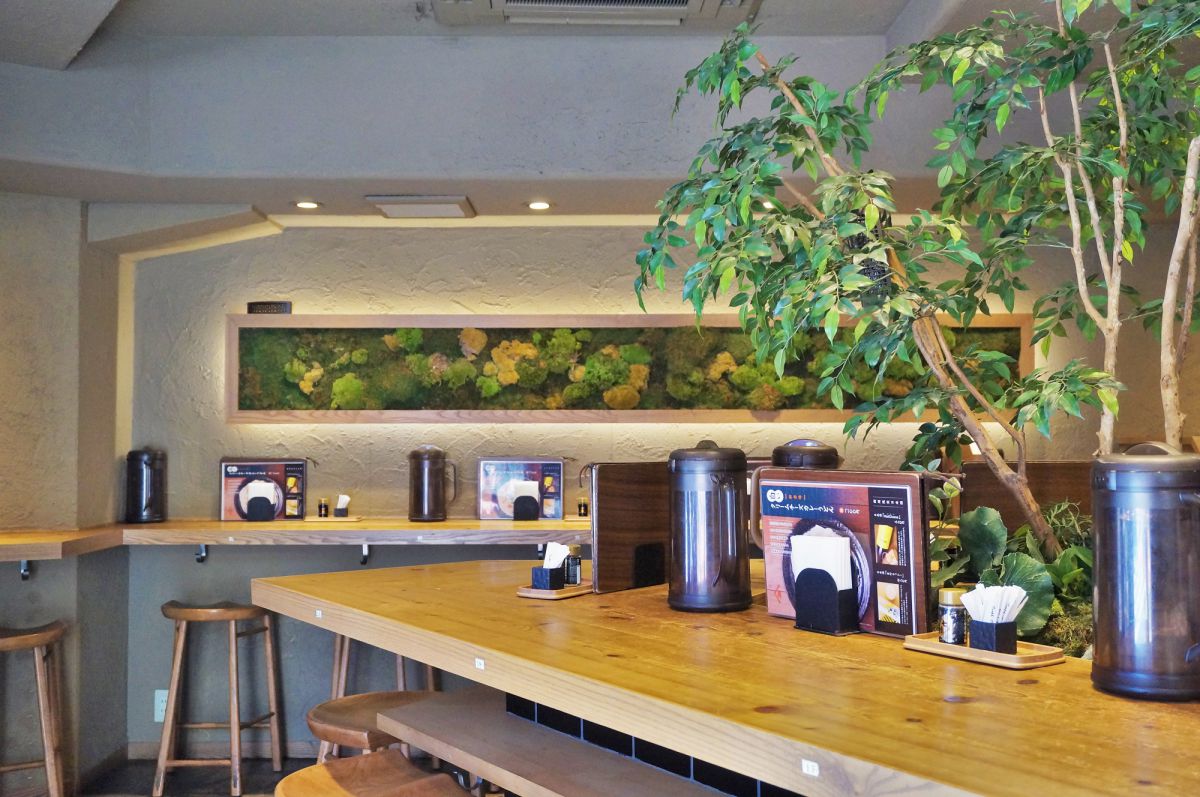 木製の机や椅子だけでなく、壁には苔が敷き詰められた額、店内中央には日本庭園のようなグリーンもあるので、全体的にナチュラルな印象。