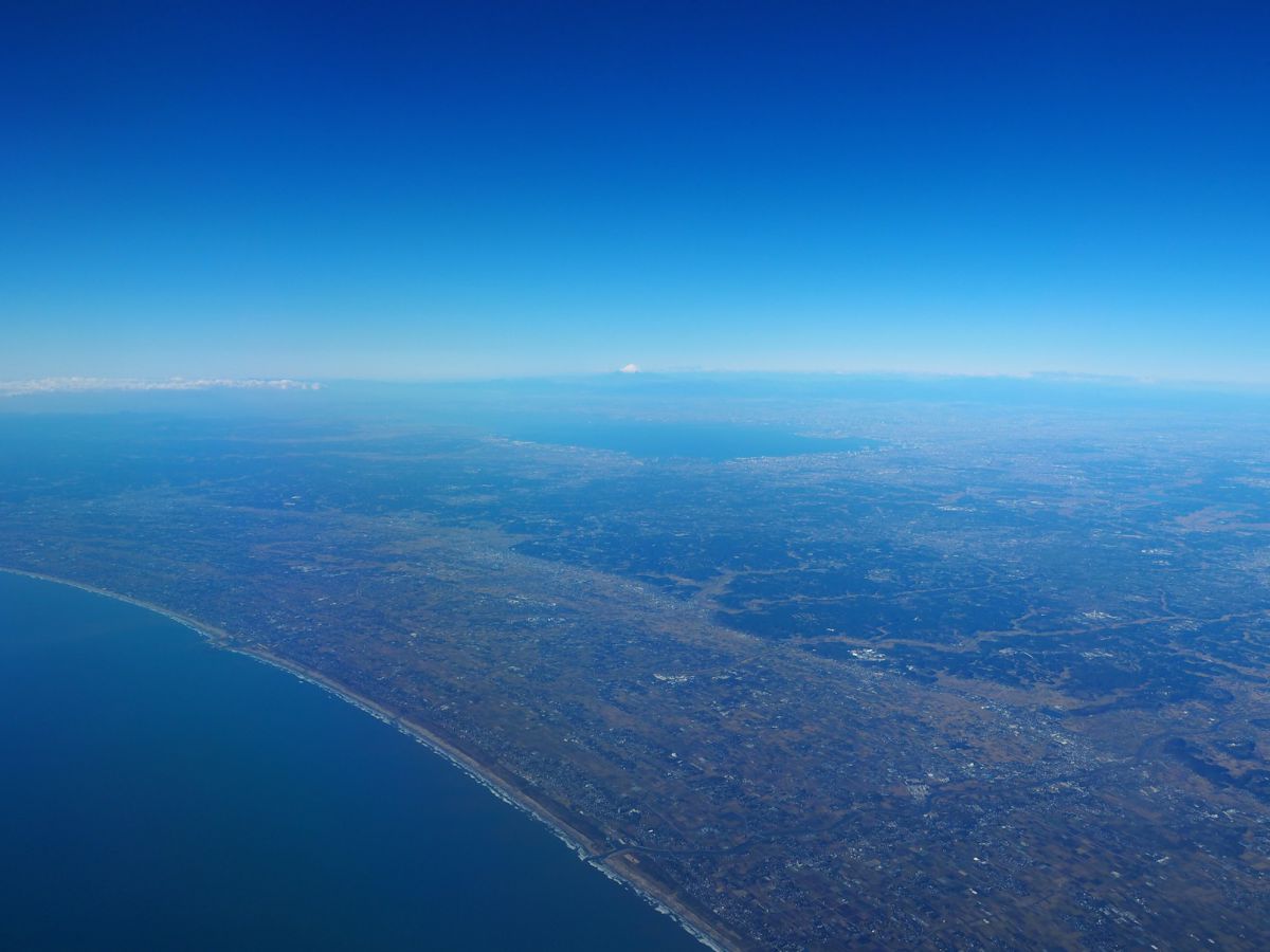 成田空港を飛び立つと、九十九里浜が!滑らかな曲線がとってもきれい。遠く先に、富士山が写っているのわかりますか??