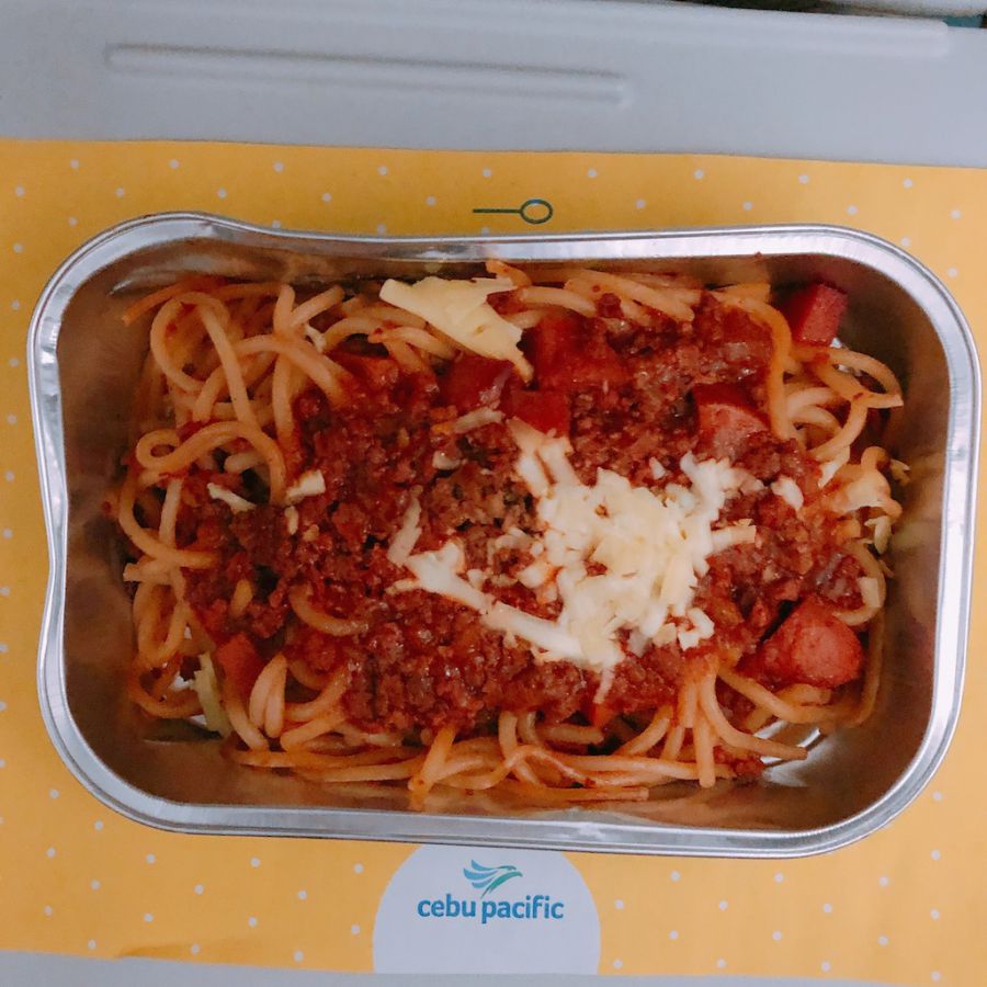 セブ・パシフィック航空の機内食は「フィリピンの家庭料理」がベース。お食事が美味しかったのでご紹介したいと思います!フィリピンといえば、お肉料理が有名ですが機内食にも牛肉、豚肉を使ったお料理が揃います。ほかにももちろんお魚料理やサンドイッチなど、どれにしようかアレコレ迷いに迷って、まずは往路で選んだのがこちら、「ピノイ・スパゲティ」。甘めのバナナケチャップで味付けされたトマトベースのスパゲティにスライスしたソーセージとチェダーチーズがトッピングされています。こちらの甘いスパゲティはフィリピンの国民的ファーストフード店「ジョリビー」の定番メニューでもあるので、ローカルでももちろん人気。