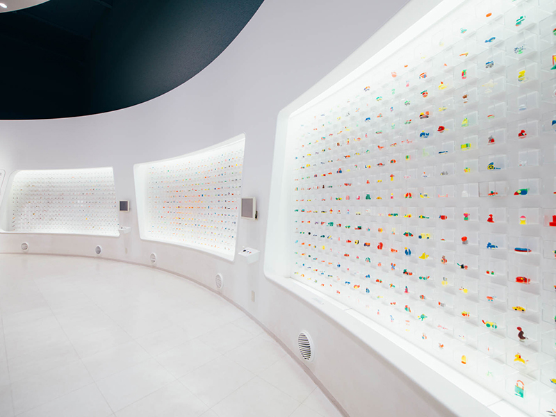 「グリコ」に付いていたおもちゃも展示。昭和レトロなものから最新のものまで、約1,500点が並ぶゾーンで、「コレ集めてたな」「今はこんなおもちゃなんだ」など、「グリコ」のおもちゃの歴史をたどることができます。