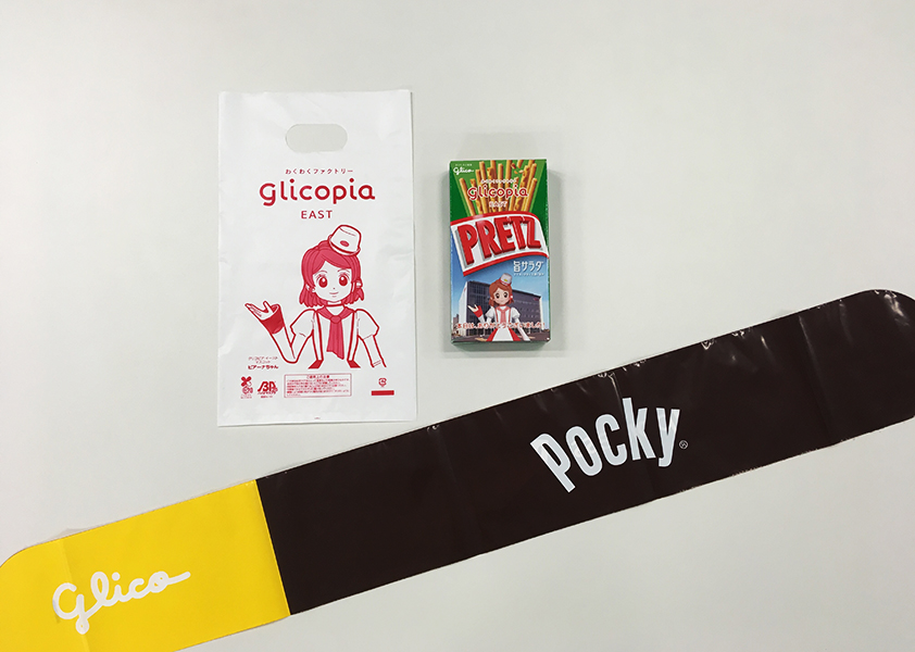 お土産は、「ポッキー」の形をした風船と、グリコピア・イースト限定パッケージのプリッツ。「ジャイアントポッキー」にデコレーションができる有料体験(500円)も人気です。