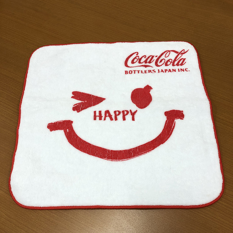 お土産はオリジナルのタオルハンカチ。ビンの「コカ・コーラ」もその場で試飲可能です♩