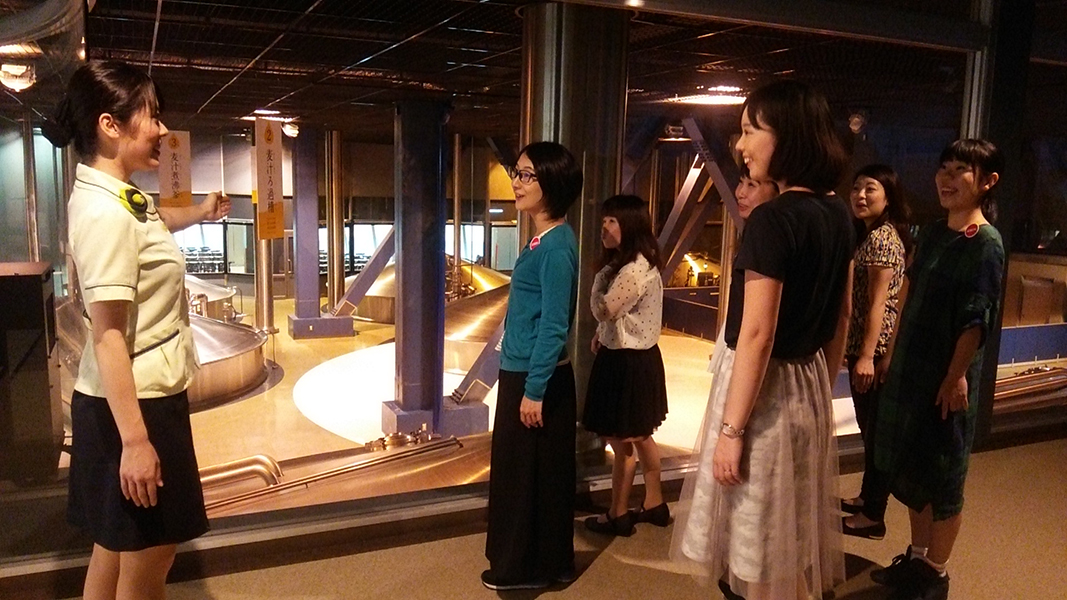 見学ツアーでは、麦芽の試食をはじめ、ホップを手にとり香りを体験できたり、麦芽を煮込む巨大な仕込釜を見られたり、一番搾り麦汁と二番搾り麦汁の飲み比べが楽しめたりと充実の内容に。最後はみんなで乾杯も。