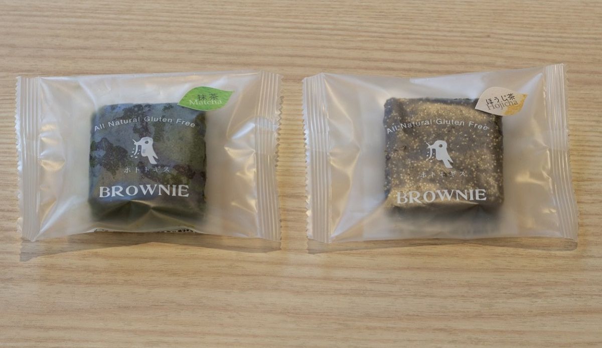 生地にグルテンフリーの米粉を使ったヘルシースイーツ「お茶ブラウニー」は抹茶とほうじ茶の2種類各240円。しっとりとした軽い食感と、濃厚なお茶の風味が楽しめます。手みやげにもおすすめです。