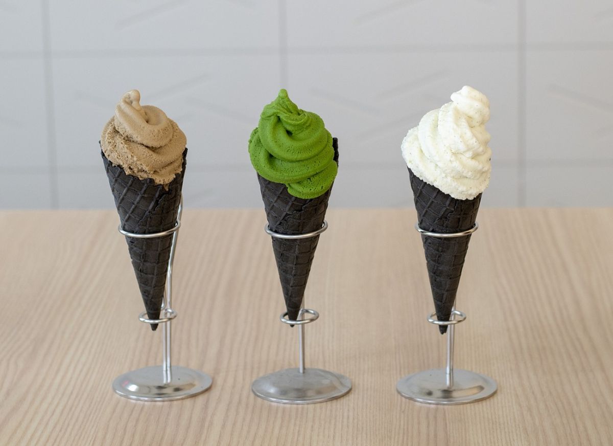 ジェラートは、茶道でも使われる上質な宇治産抹茶をたっぷり濃く3.5%も使った「濃茶ジェラート」(中)450円や、「抹茶」、「ほうじ茶」(左)、「バニラ」(右)、「季節のフレーバー(オープン時はいちご)」各380円が、全5種類が味わえます。
