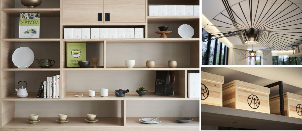 店内は「茶屋」がテーマ。和傘をモチーフにした照明や、伝統的な茶箱を取り入れた木目調の落ち着いた雰囲気が気持ちをホッとさせてくれます。光が差し込む開放的な空間にいると、茶屋の縁側に腰かけているような気分にさせてくれます。
