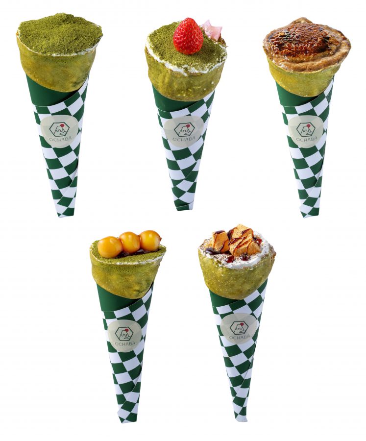 「OCHABA日本茶クレープ専門店」で味わえるのは、日本茶や抹茶を使ったモチモチの生地をベースにした焼き立て、巻き立て、濃厚もちもち緑の和風クレープ。1番のおすすめは、マスカルポーネと生クリームを合わせた特製の「ティラミスプレーン」(上段左)600円。