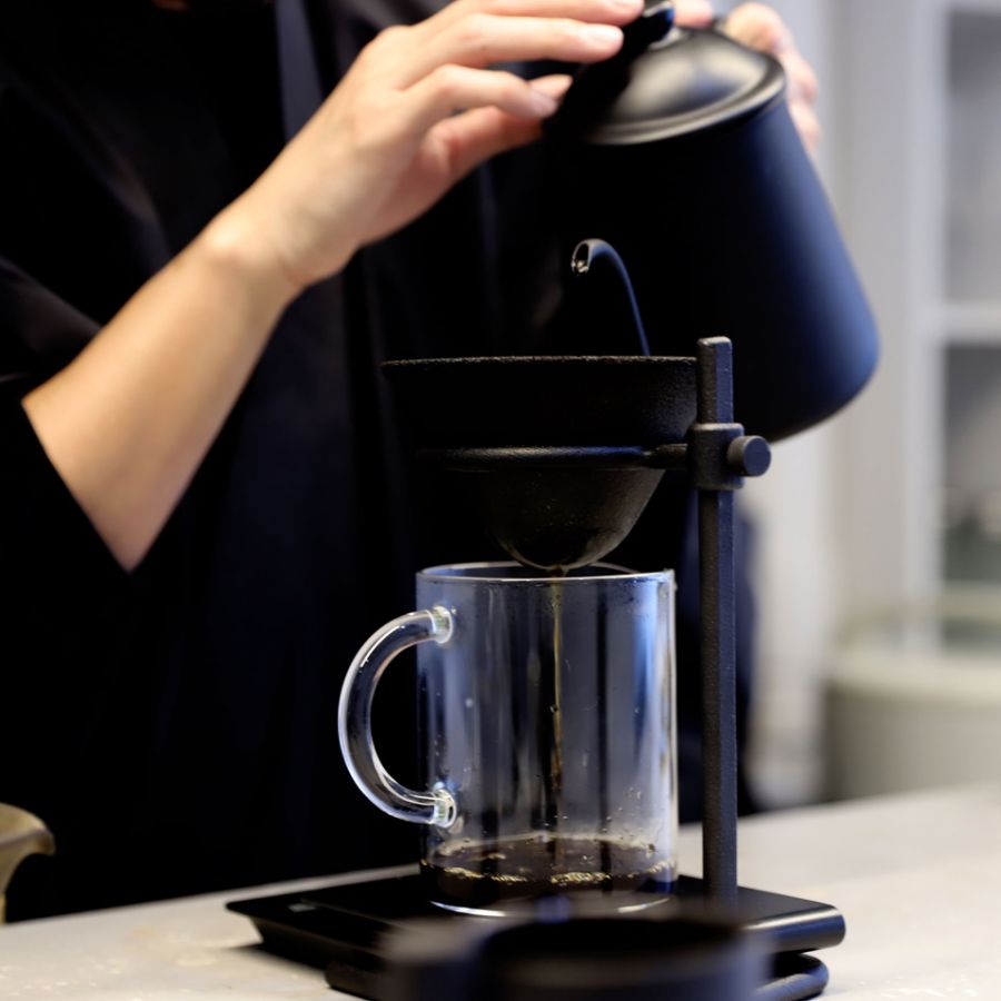 お次はコーヒーに。同じ大阪市の大正区にある珈琲店「井尻珈琲焙煎所(いじりこーひーばいせんじょ)」の深煎ブレンドを、有田焼のドリッパーを通してハンドドリップで抽出。