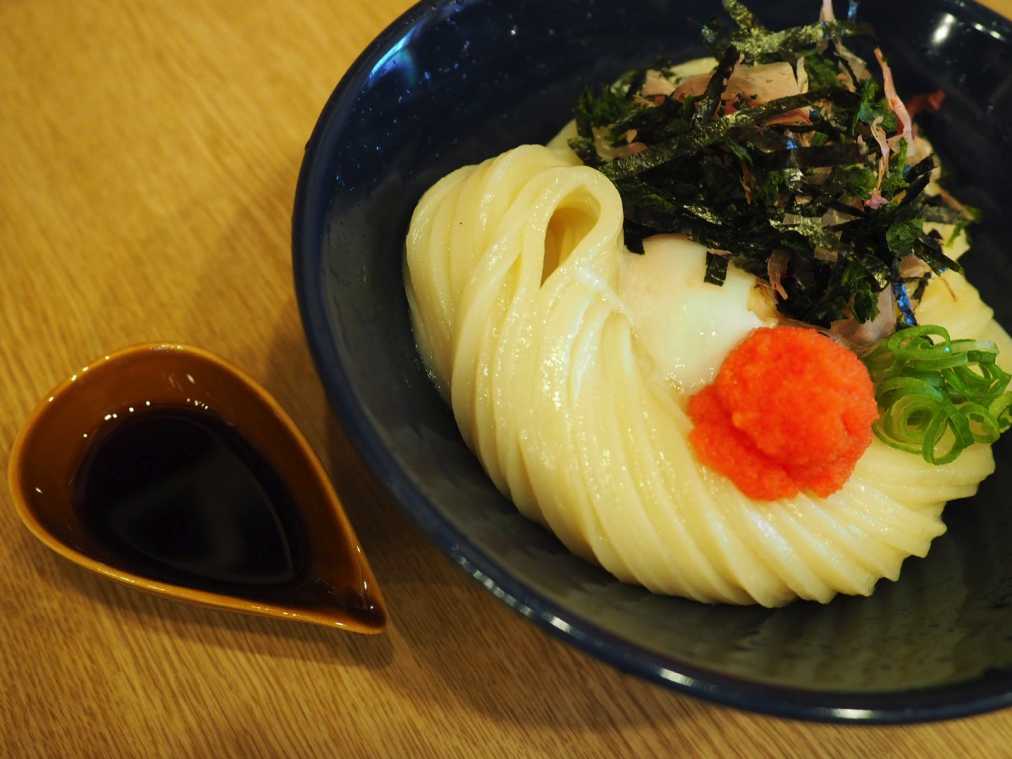 そんなこだわりのうどんがこちら!螺旋状に美しく盛られたツヤツヤの冷たいしょうゆうどんに、明太子、磯のり、そして温泉卵をトッピングした1杯です(すべてトッピングして1250円)。
