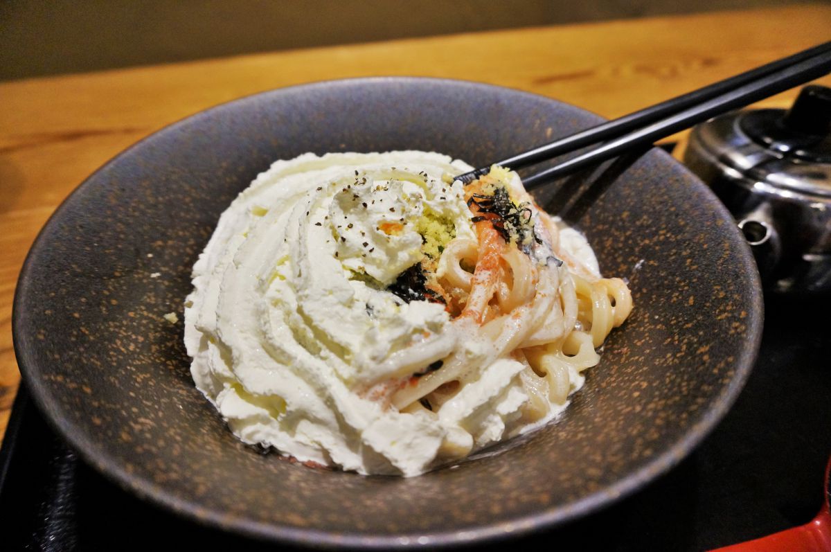 40種類以上あるうどんメニューのなかで、特に女性に人気なのが「白い明太チーズクリームうどん」(税込1100円)。