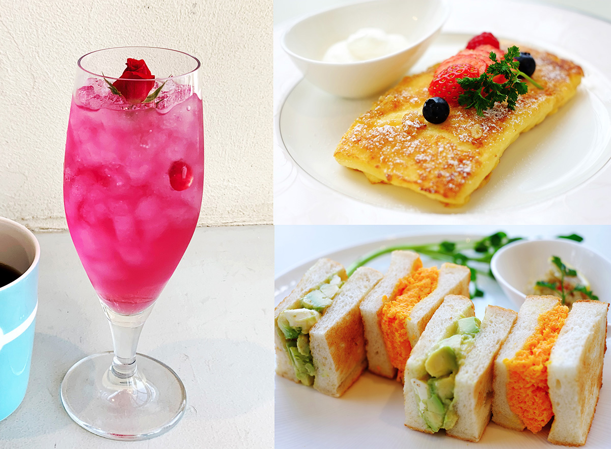 カフェ自慢のサンドイッチ料理や、人気№1スイーツ・フレンチトースト、クレオパトラが愛したバラのエキスを抽出したジュースなど、店のこだわりメニューがおすすめです。