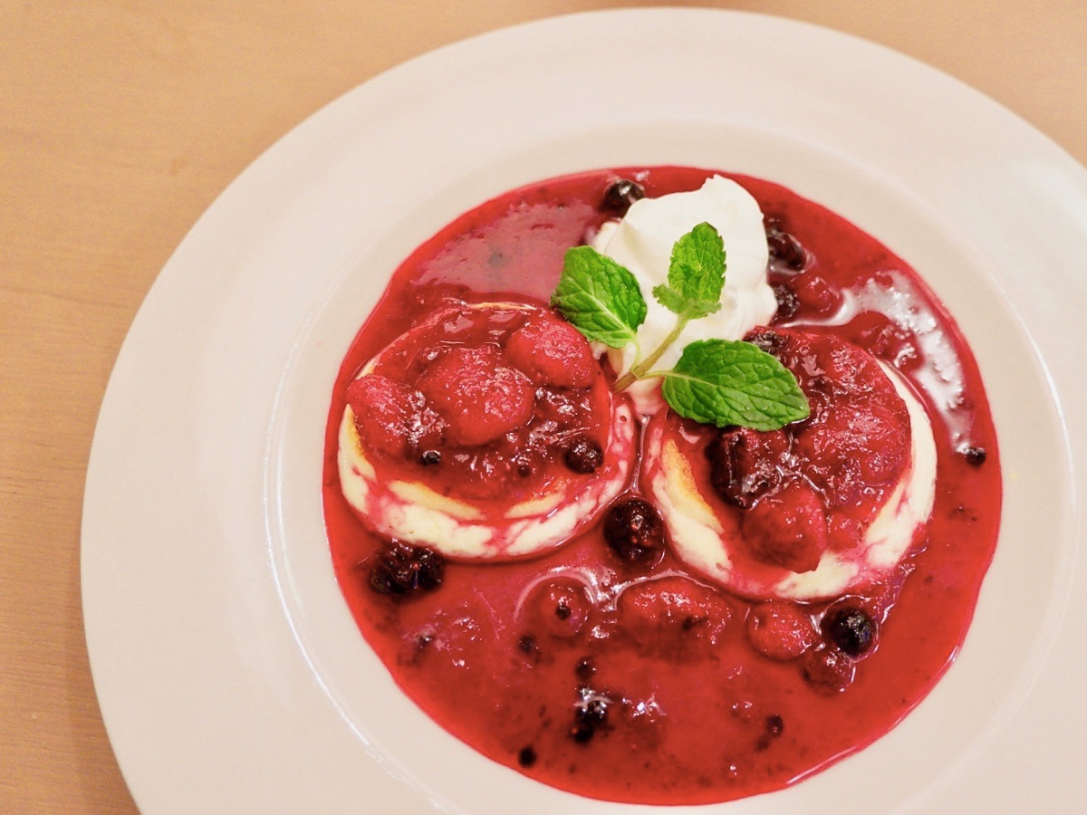 真っ赤な果実のソースがかけられた小さなパンケーキは「シルニキ」。