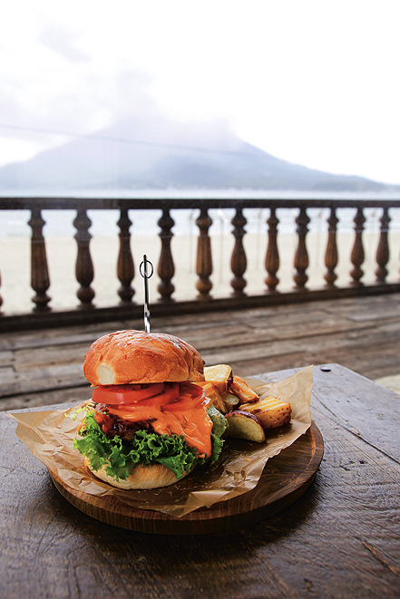 2つ目には、目の前に錦江湾と桜島が広がる絶好のロケーションのカフェ「Factory」。こちらのカフェでは、鹿児島食材をふんだんに使った料理が揃えられています。イチオシは、「黒牛&黒豚ファクトリーバーガー(1380円)」。