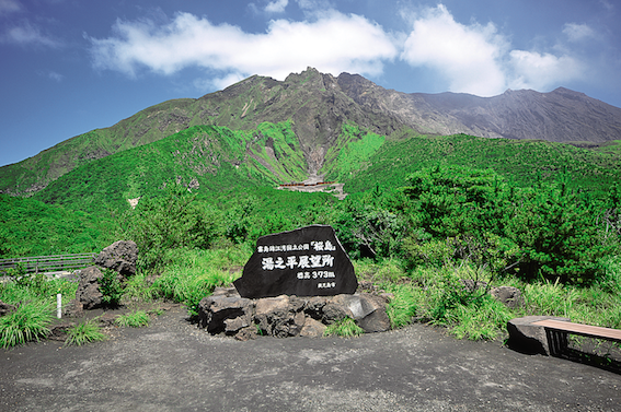 桜島の主要なみどころを周遊するお手軽ルートをご紹介。まずは「烏島(からすじま)展望所」へ。かつて桜島の沖合500mに浮かんでいた烏島は、噴火で溶岩流に飲み込まれ埋没、桜島と陸続きになったそう。ここは烏島だった場所を整備した展望所で、噴火を解説した記念碑が立っています。大迫力の自然の力を実感しましょう。