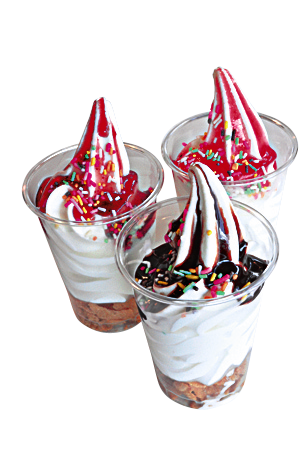 まるで溶岩が流れ出ているような「溶岩パフェ」(各300円)。イチゴ、チョコ、ブルー ベリーの3種類あります。