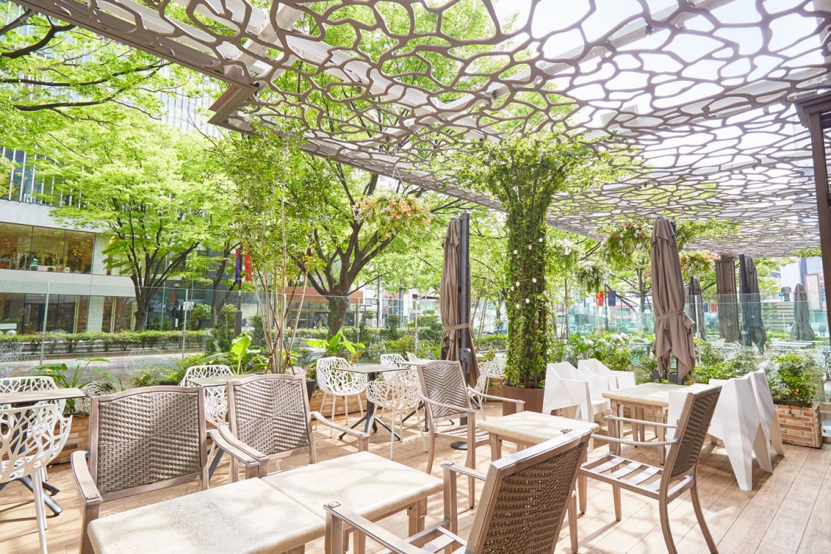 緑の木洩れ陽が差し込むテラスは開放感たっぷりです。上品でありつつ華やかな雰囲気は、NYをイメージしているからなんだそう。ティーセットに対する期待が高まりますね。