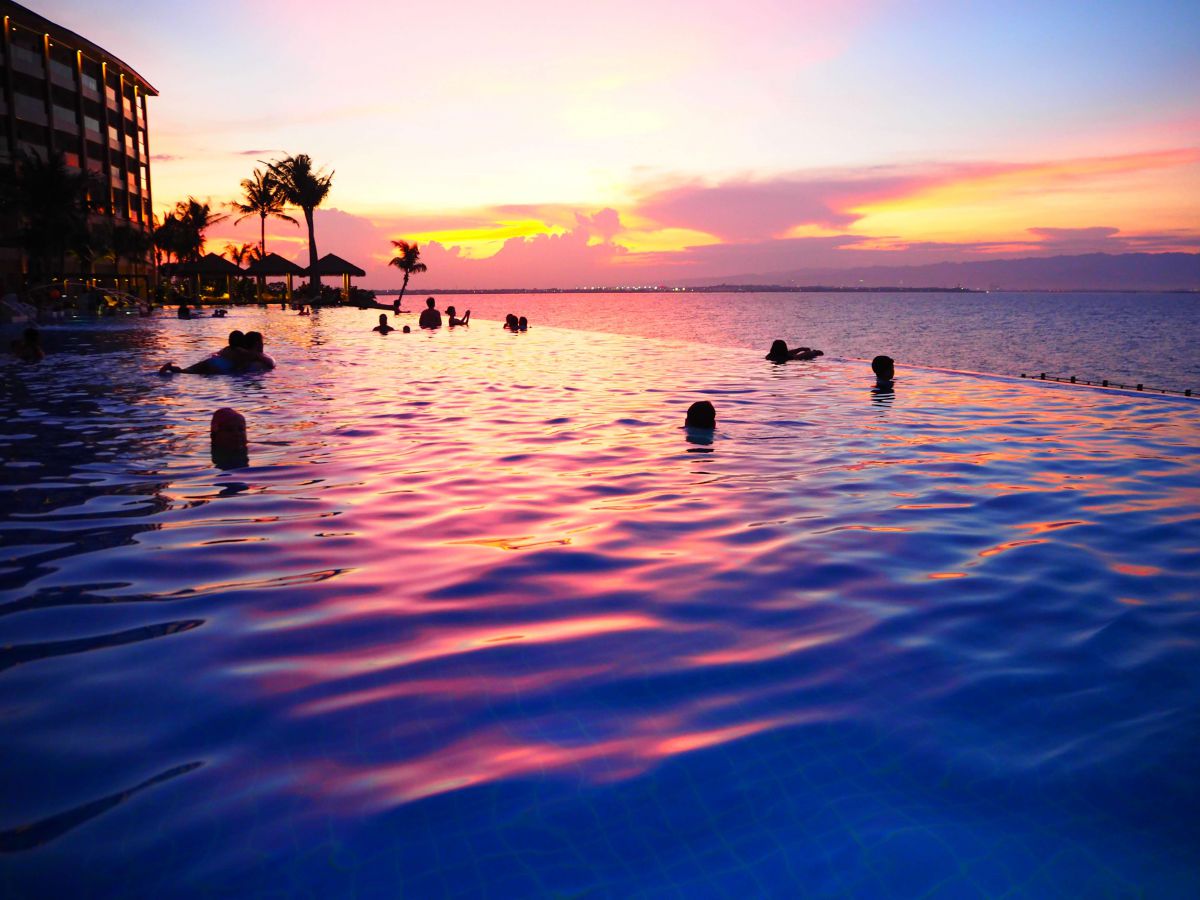 「デュシット マクタン セブ」の一番の魅力はサンセット!! プールと海がひとつになって茜色に染まる瞬間はとっても感動的…。