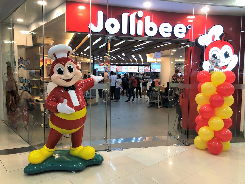 そしてフィリピンの国民的ファーストフード「ジョリビー」(Jollibee)!! 赤いハチのキャラクター”ジョリビー“くんが笑顔で出迎えてくれます。”さあ、おいで!! “と口角上がってる!けっこう大きい…!