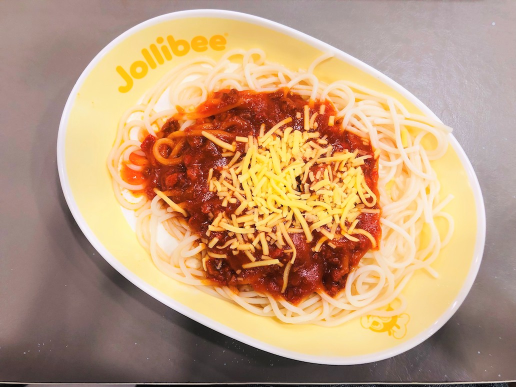メニューはすべて値段付きで写真で紹介されているので、オーダーもらくらく。初めてのジョリビー体験は、やっぱり定番メニューのひとつ“ジョリビー・スパゲティ”をオーダー。待つこと5分。すぐに番号が呼ばれてでてきたのがコチラ!なんか懐かしい気持ちにさせられるスパゲティーですね。では、早速いただいてみましょう。