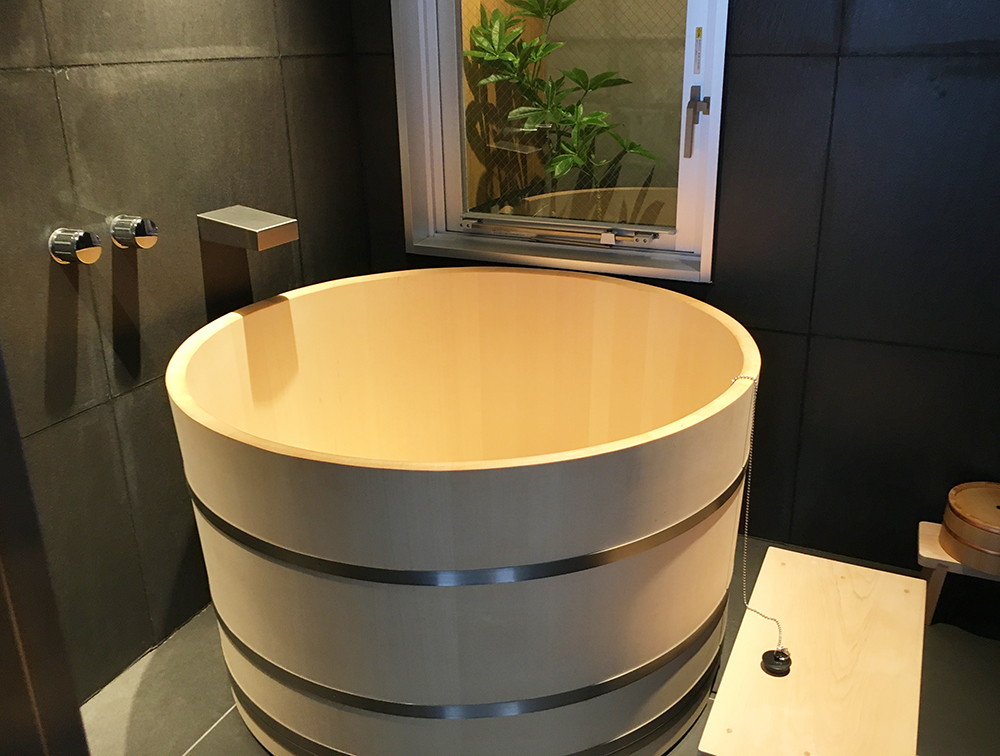 バスルームにはヒノキの樽風呂が。ヒノキの香りに包まれたバスタイムで、旅の疲れも吹き飛びそう。