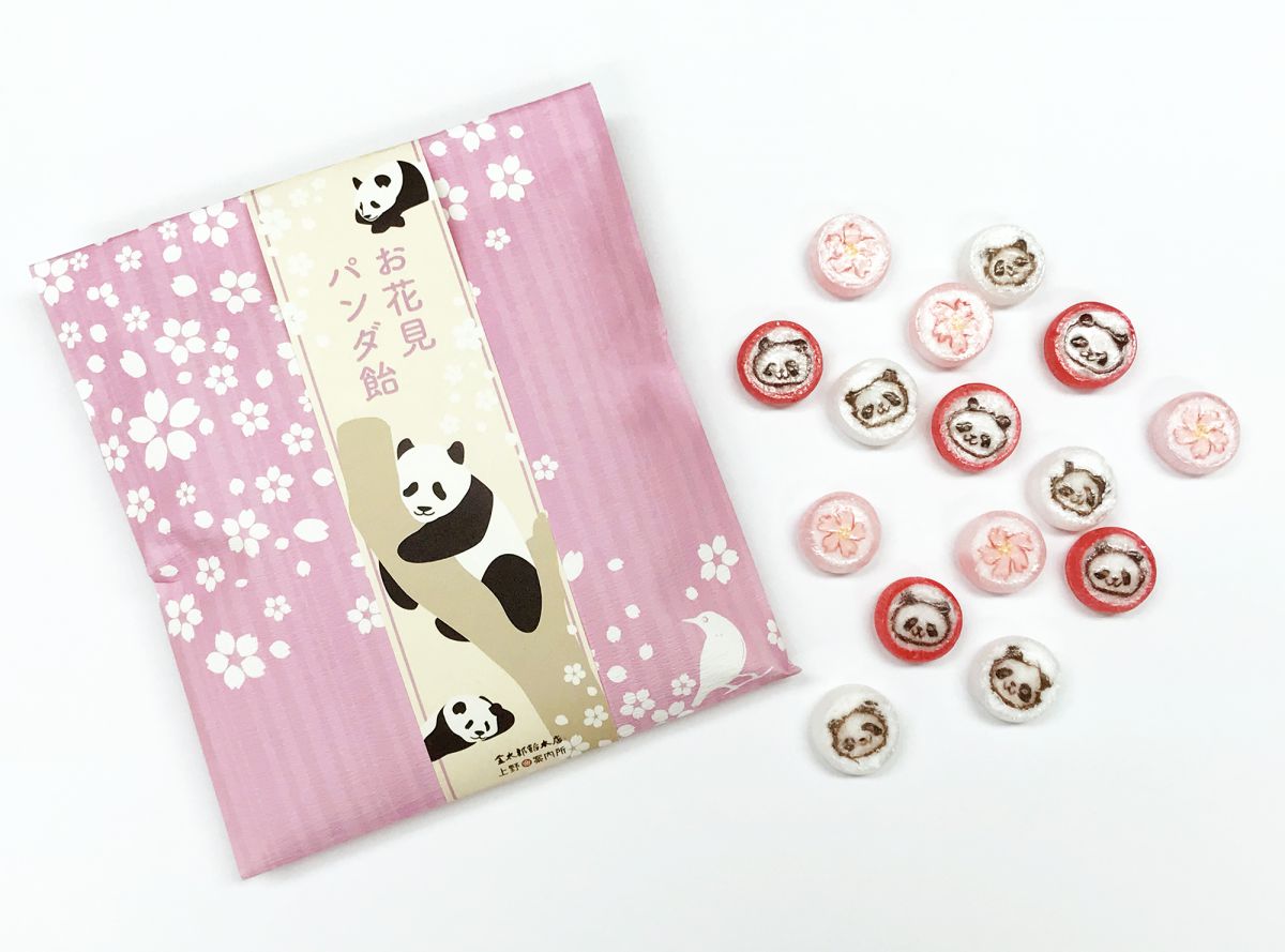 桜シーズンに大好評!の「お花見パンダ飴」400円、シャンシャンファミリーをモチーフにした新デザインで登場。おめでたい紅白のパンダ飴(いちご/ソーダ味)に、さくら飴(ピーチ味)が仲間入り。上野案内所限定パッケージなので必見です。