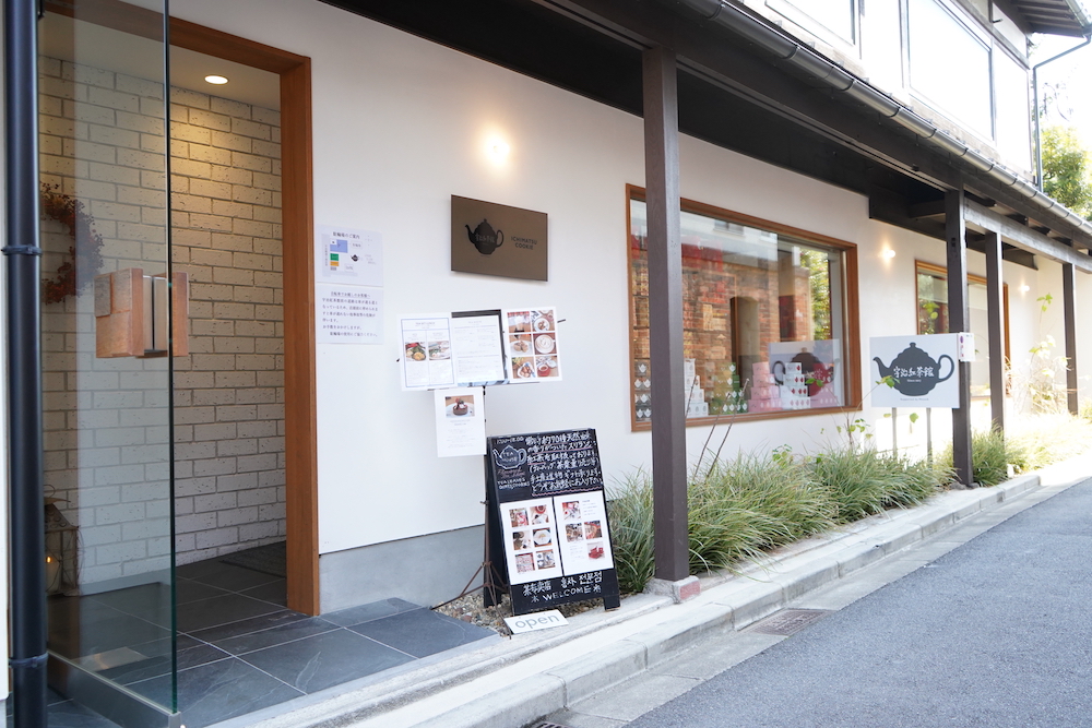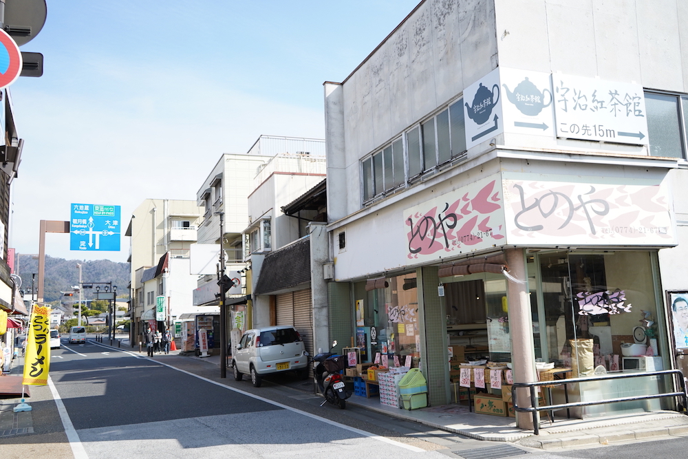 JR宇治駅から宇治川へとつづく商店街「宇治橋商店街」を歩き、商店街が途切れる手前にある細い路地を入るとすぐの場所に『宇治紅茶館』はあります。見逃さないように大きな看板が出されているので、目印にして歩きましょう。