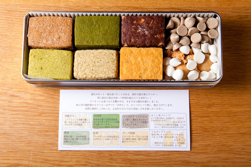 “食材のランクを落とすと、私の店のランクまで落ちてしまう”と決して妥協を許さない米村シェフが、宇治の抹茶、煎茶、宇治紅茶館で扱うムレスナティーの紅茶を素材に取り入れて作った市松模様のクッキー缶。