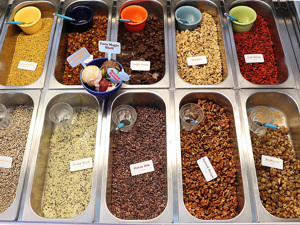 トッピングは、スーパーフードといわれているヘンプシード、ビーポーレン、カカオニブや塩キャラメルソースなど全部で13種類。
