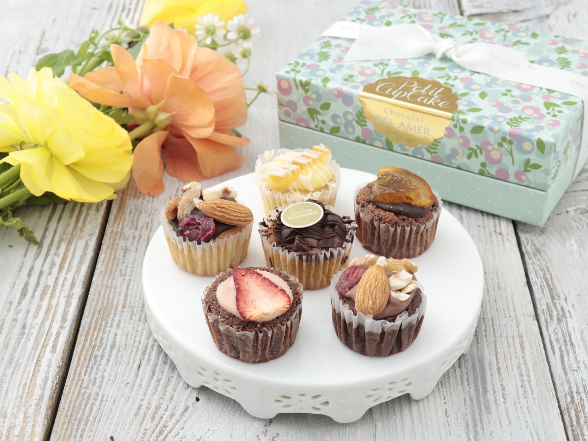食べやすいサイズの「ショコラカップケーキ(6個入)」1944円は、食後のデザートやティータイムにぴったり。ふわっとした食感のケーク生地をショコラやフルーツ、ナッツでかわいくデコレーション。なめらかな生地にトッピングしたフルーツやナッツの食感がちょうどいいアクセントに。チョコレート専門店ならではの本格的な味わいです。