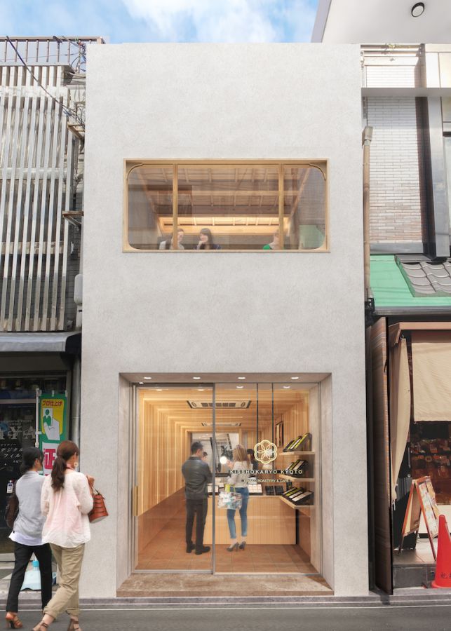 真っ白な2階建ての建物の1階は物販、2階がカフェスペースになっています。京都の敷地に特徴的なうなぎの寝床(奥に細長い)を「cafe.co」による設計で見事にリノベーション。モダンで明るい店舗に仕上がっています。