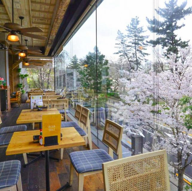 「Aloha Table」はハワイのワイキキに本店を構える、ライフスタイルをコンセプトにしたカフェ。ウッディな素材のインテリアやサーフミュージックが心地よく雰囲気もゆったり♪こちらも一面に大きな窓があり、桜の時期は通りの木々がピンクに染まります。