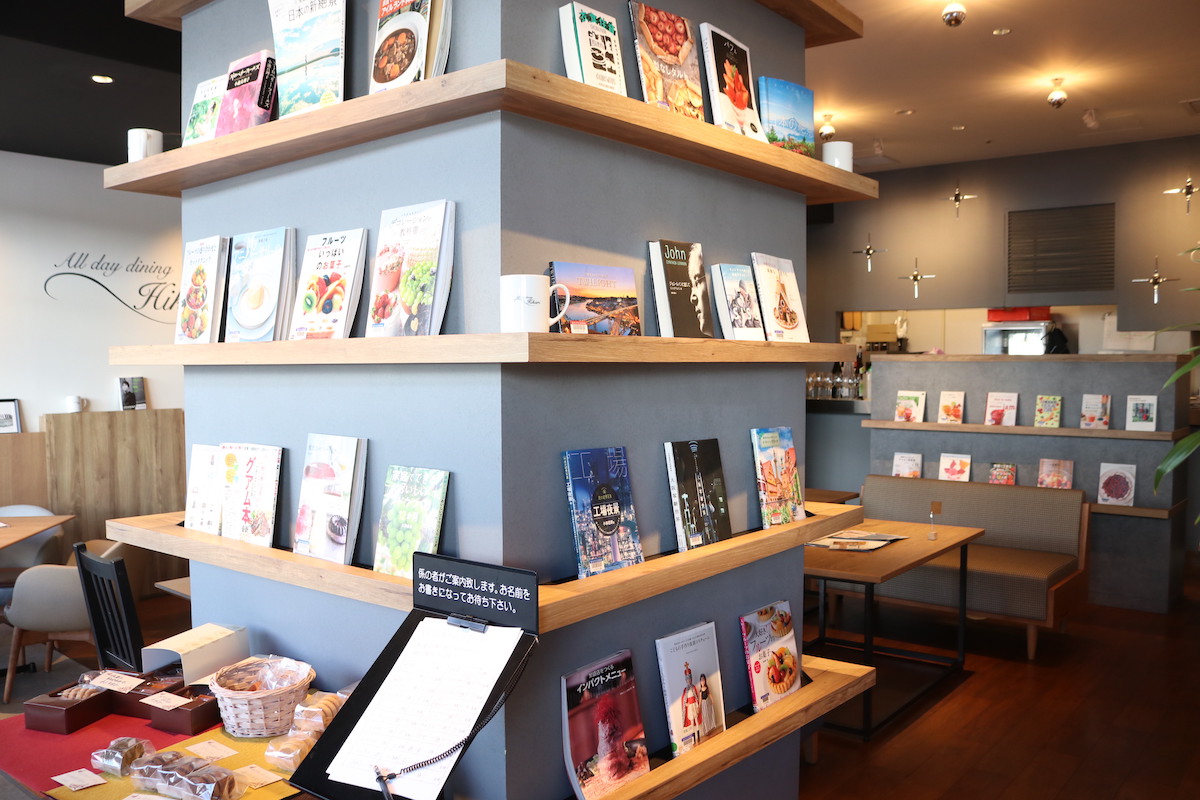 店内に飾られた本は、近隣の「高石図書館」の館長がセレクト。スイーツや食関係の本のほか、サブカルチャーやガイド本なども並ぶ魅力的なラインナップで、食後の読書タイムも楽しめます。気に入った本は図書館で借りられるのもうれしい!
