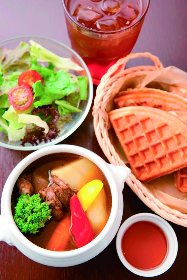 十勝しんむら牧場の敷地内にあるカフェ。「ソフトクリーム」350円や「ミルクティー」600円など、放牧牛乳のおいしさをそのまま味わえるのが魅力です。道産小麦を使用したスコーンやワッフルのセットメニューが人気。写真は十勝産の野菜と地鶏を使用した「牧場スープカレーセット」1400円。ワッフルと一緒にいただきましょう。