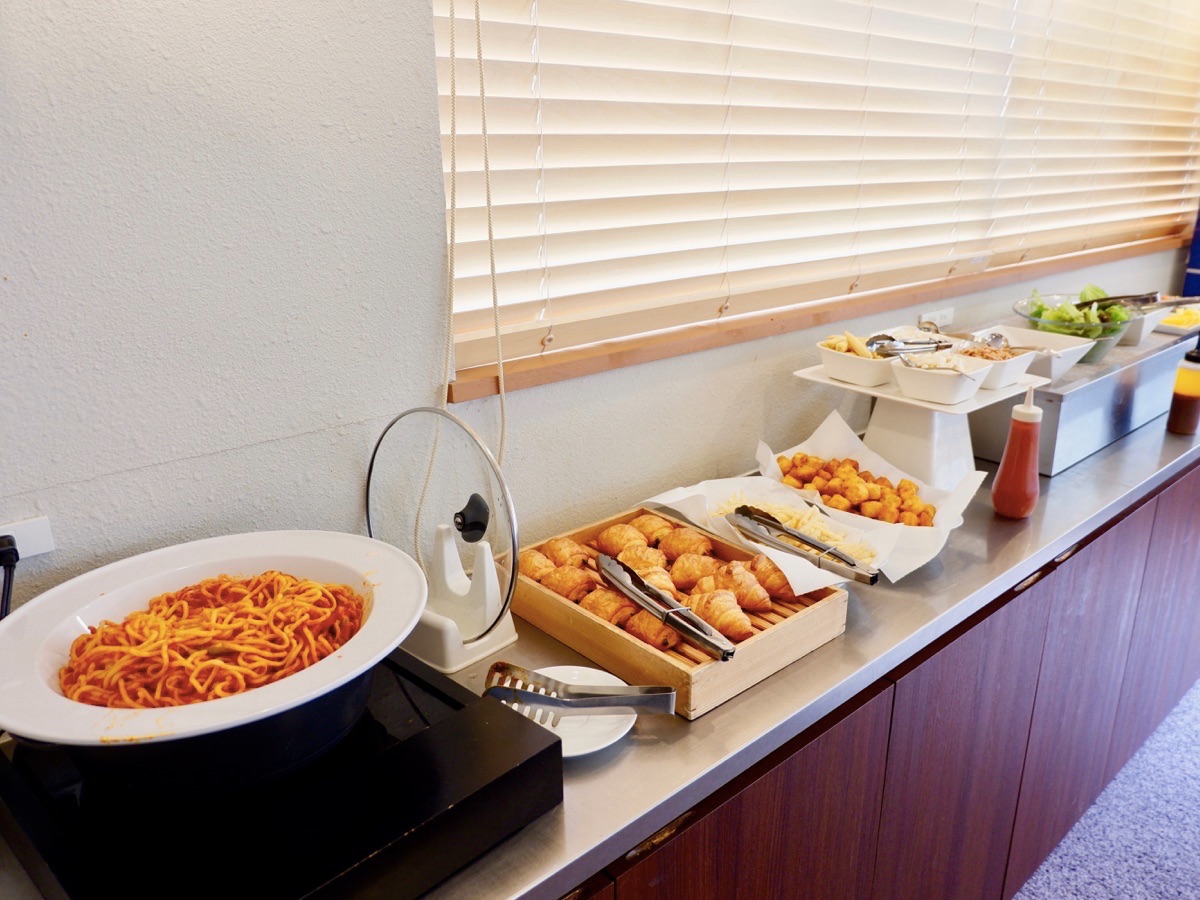 ブッフェは、スパゲッティ、パン、サラダなどいろんな種類を楽しめますよ。