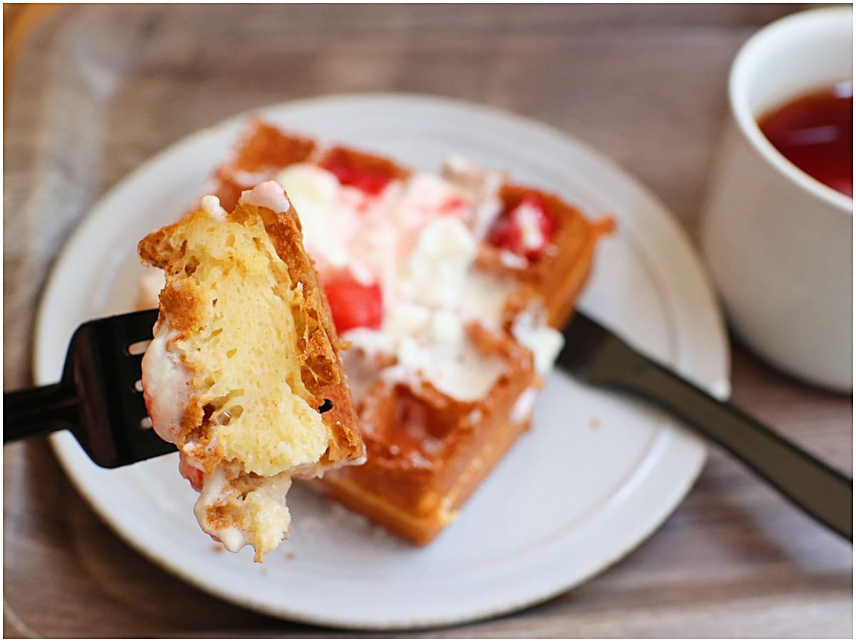 香ばしく焼かれたワッフルの上には、クリームと果肉たっぷりのいちごのソースが。